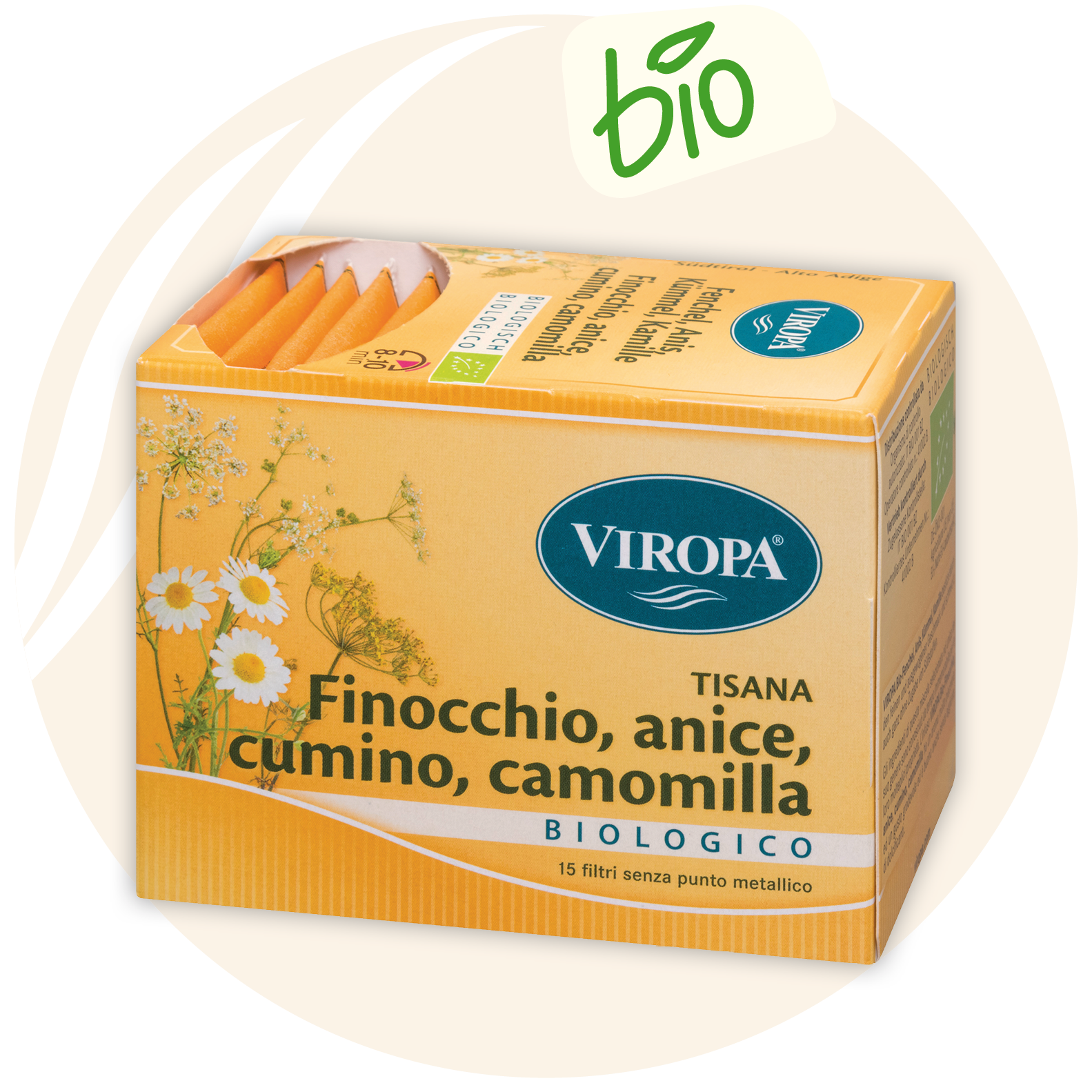 mettere la bustina filtro dell’infuso biologico FINOCCHIO, CUMINO, ANICE, CAMOMILLA di Viropa in una tazza, versare 200ml di acqua calda e lasciare in infusione per 6- 8 minuti.