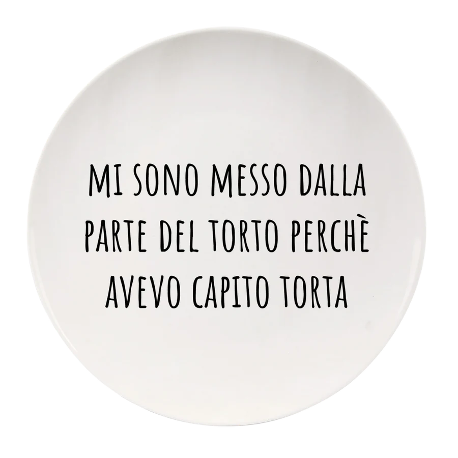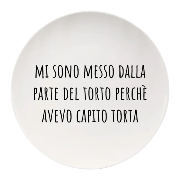 Celebra la vera golosità con questo divertente piatto “Mi Sono Messo dalla Parte del Torto”! Con la sua scritta ironica “mi sono messo dalla parte del torto perché avevo capito torta”, questo piatto è perfetto per tutti i golosi che sanno che quando si tratta di dolci, si può anche cambiare schieramento!
