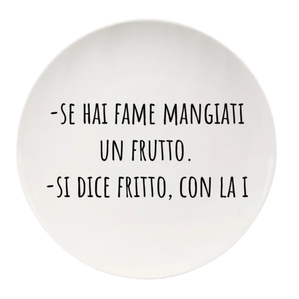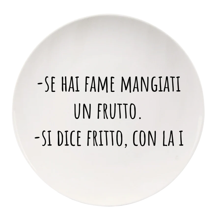 Celebra la vera golosità con questo divertente piatto “Si Dice Fritto”! Con la sua scritta ironica “se hai fame mangiati un frutto. Si dice fritto con la i”, questo piatto è perfetto per tutti i golosi che sanno che quando si ha davvero fame, un frutto non basta!