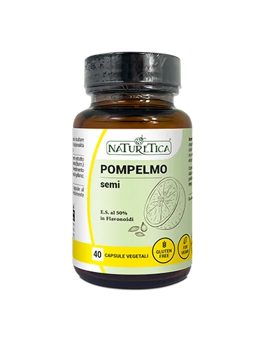 estratto di Pompelmo (Citrus grandis (L.) Osbeck e Citrus x paradisi Macfad.) semi e pericarpo estratto secco* titolato al 50% in bioflavonoidi/naringina 40%, Pompelmo (Citrus x paradisi Macfad.) semi polvere, Agente di rivestimento (capsula): idrossipropilmetilcellulosa, agente di carica: fosfato dicalcico, agenti antiagglomeranti: sale di magnesio degli acidi grassi e biossido di silicio. *contiene maltodestrine.