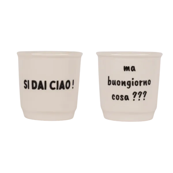 Inizia la giornata con ironia grazie a questo divertente Set di tazzine da caffè con le scritte “Si dai ciao!” e “Ma buon giorno cosa???”. Due tazzine che rappresentano perfettamente il cattivo umore mattutino di chi proprio non ha voglia di essere gentile appena sveglio!