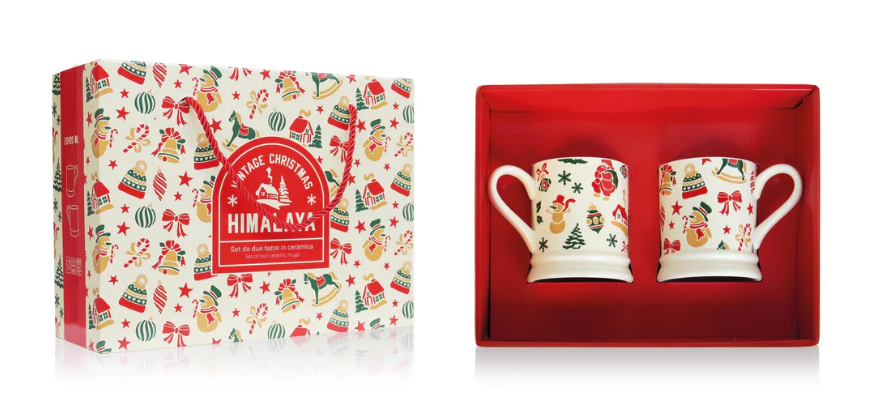 Set composto da due tazze in ceramica decorate con motivi natalizi dallo stile vintage, racchiuse in una confezione regalo in carta con manici in stoffa. Disponibili in due varianti distinte, queste tazze evocano il calore delle feste e sono l’idea perfetta per un regalo di Natale.