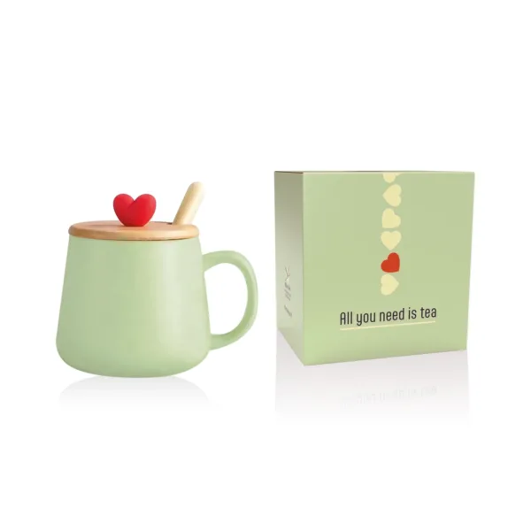 Tazza in ceramica con interno ed esterno di diverso colore. Coperchio in legno con cuore in silicone e cucchiaino in acciaio con manico colorato abbinato al colore interno.